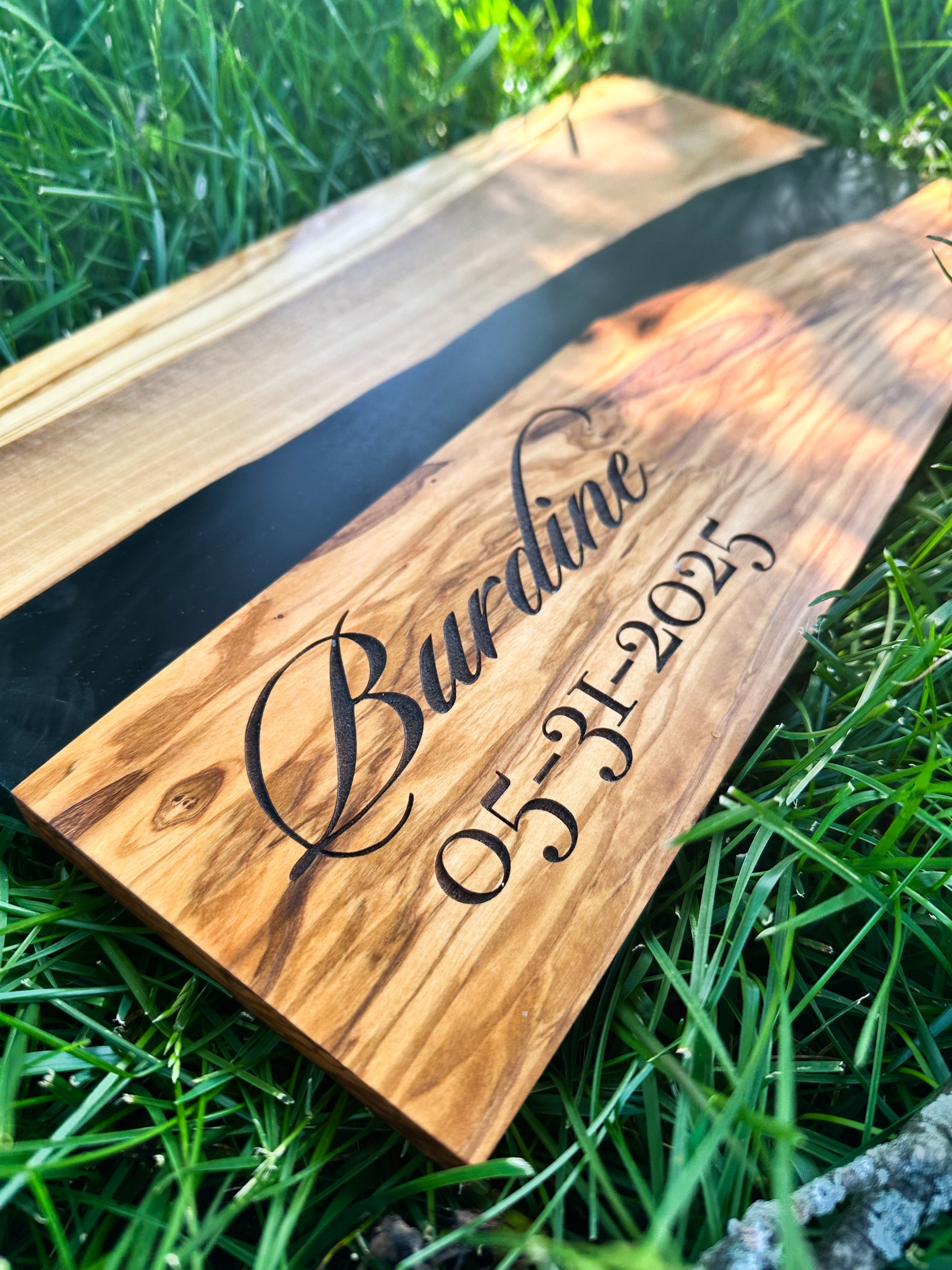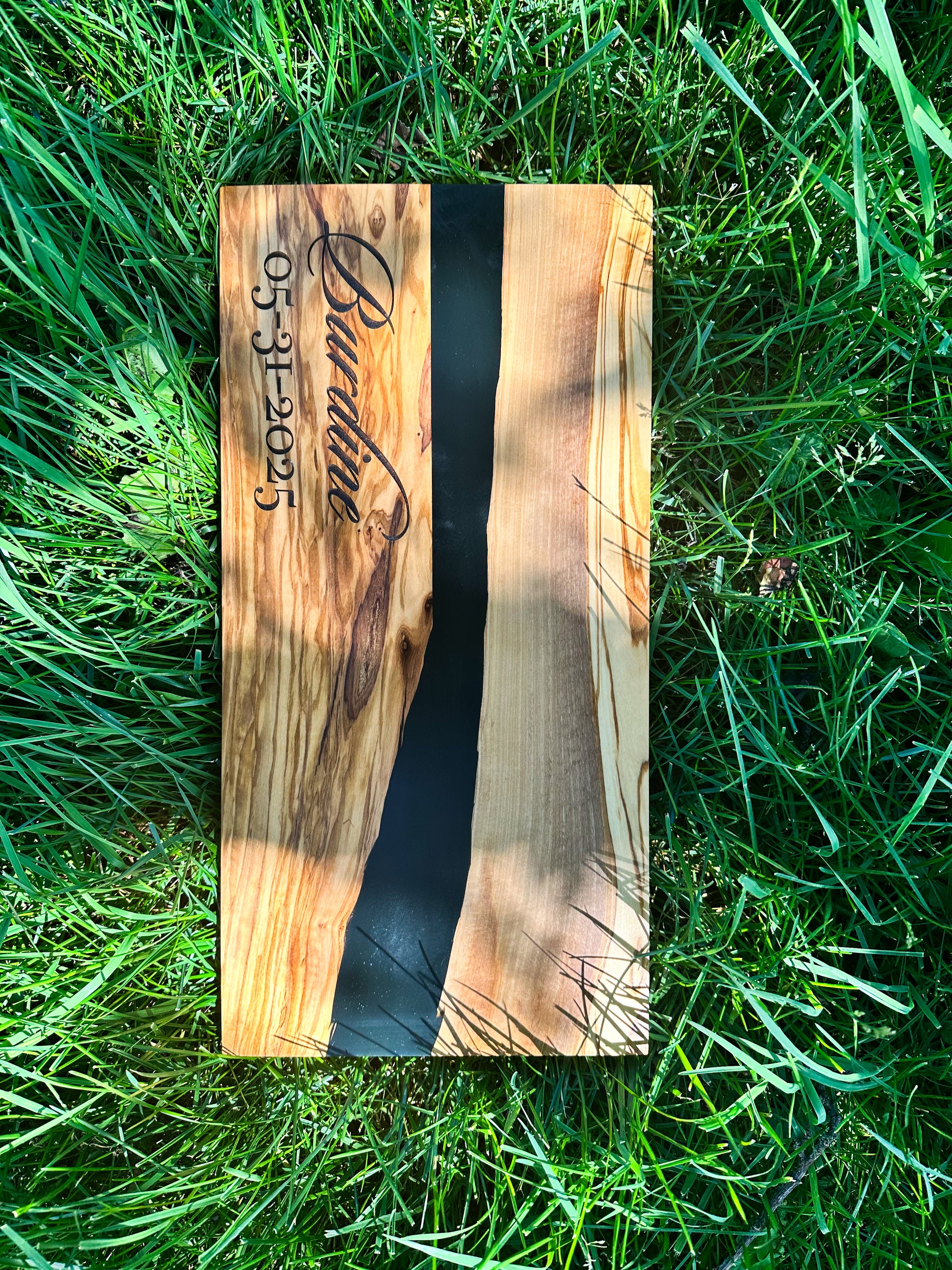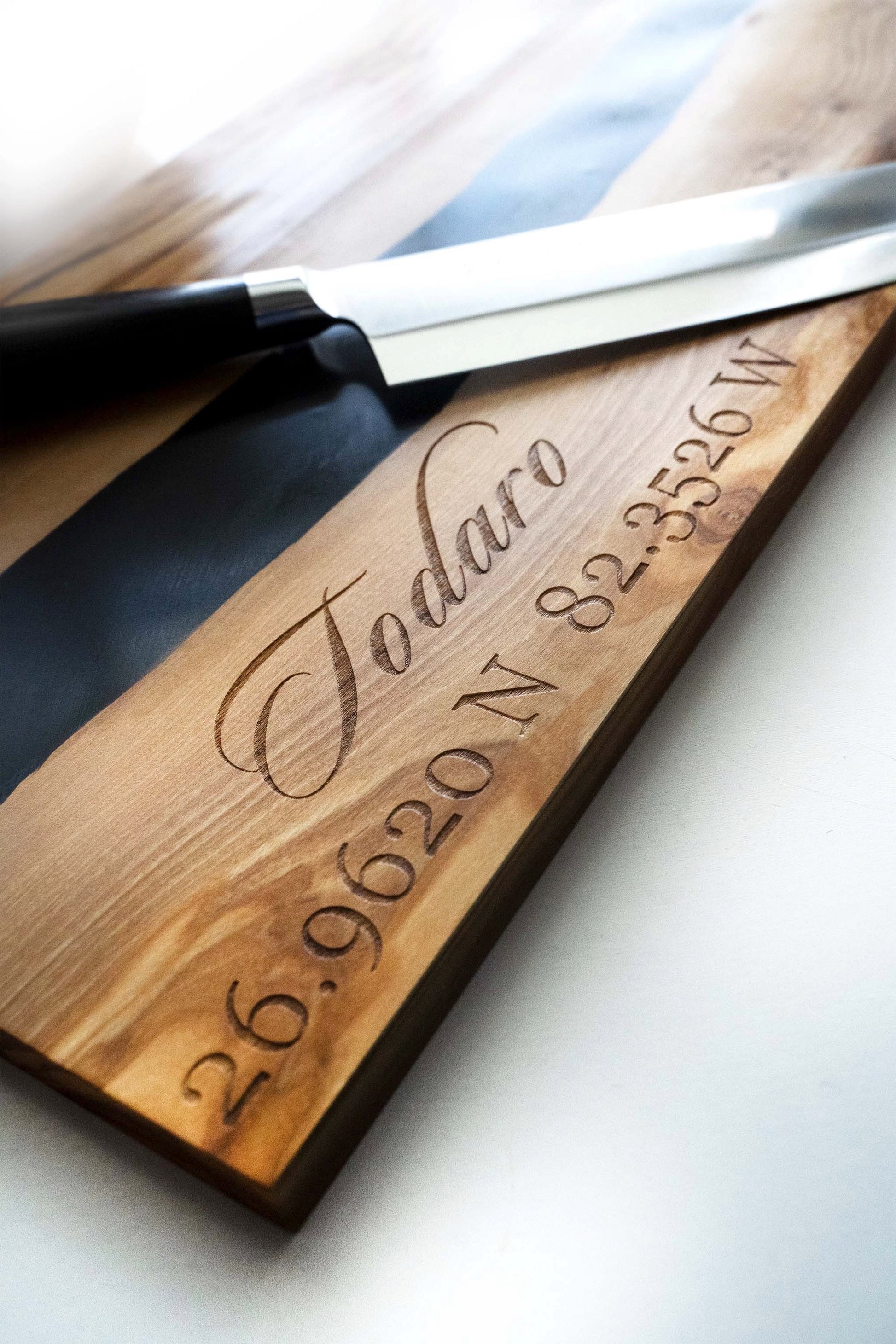 *Please note that each board is beautiful and unique, meaning the size of resin can differ as well as its path, your wood may have different patterns, colors, knots, streaks, markings, etc. and your engraving look may vary. These things allow your board to be a 'one of a kind' piece.